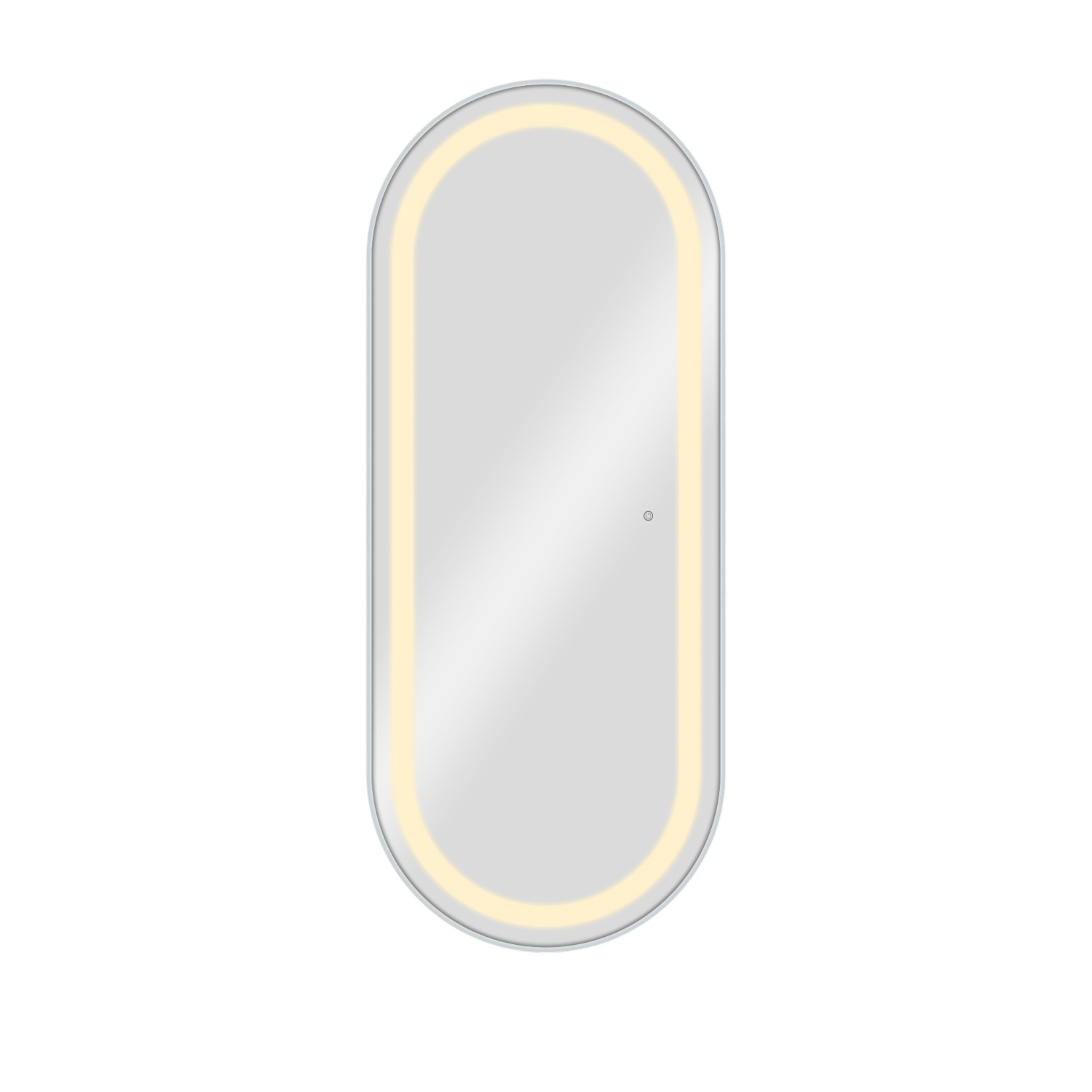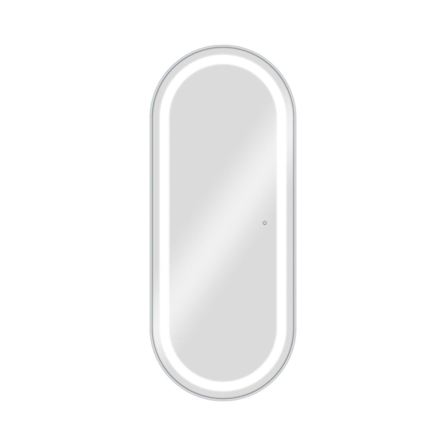 The BLISS SILVER mirror is an oval vanity mirror measuring 170x70 cm with integrated front LED lighting. It features a 4 cm light guide with dual internal LED strips for uniform illumination, eliminating edge shadows.